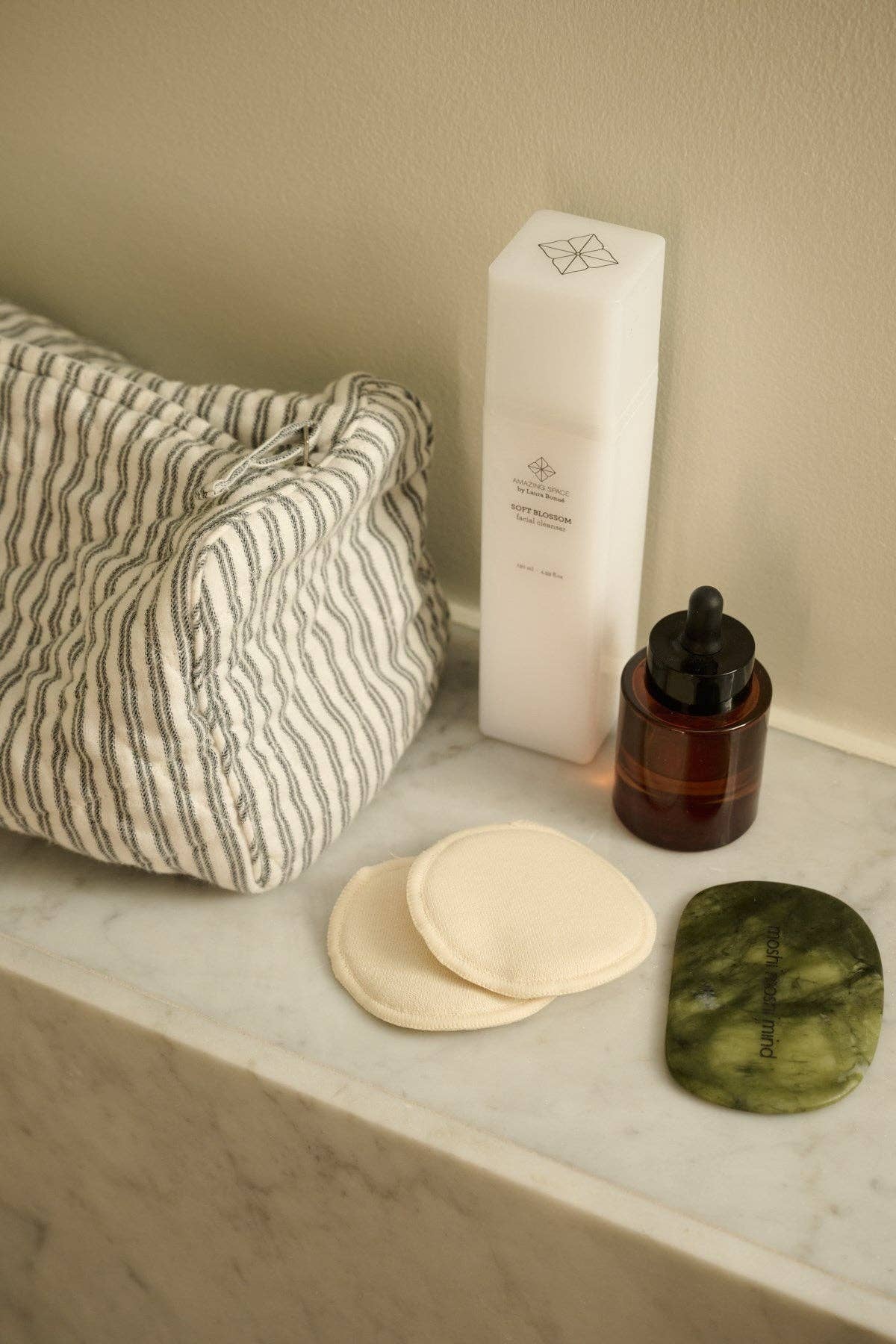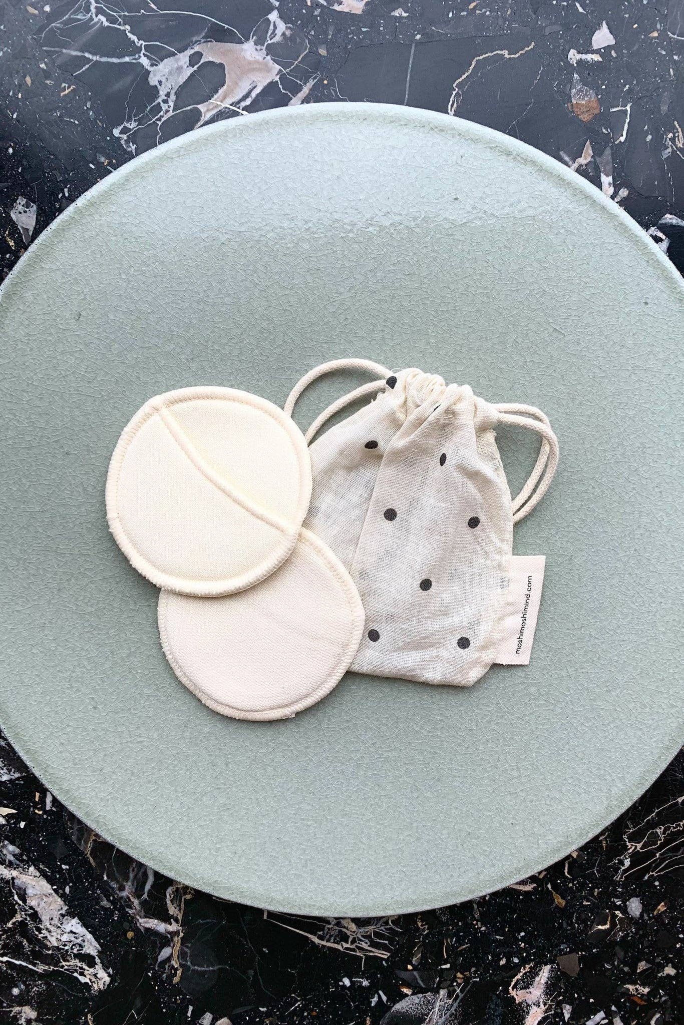 Reinige dein Gesicht mit diesen wiederverwendbaren Gesichtspads. Zwei Stück in einem kleinen gepunkteten Beutel. Waschen Sie sie nach Gebrauch mit etwas Seife und sie sind bereit für morgen.