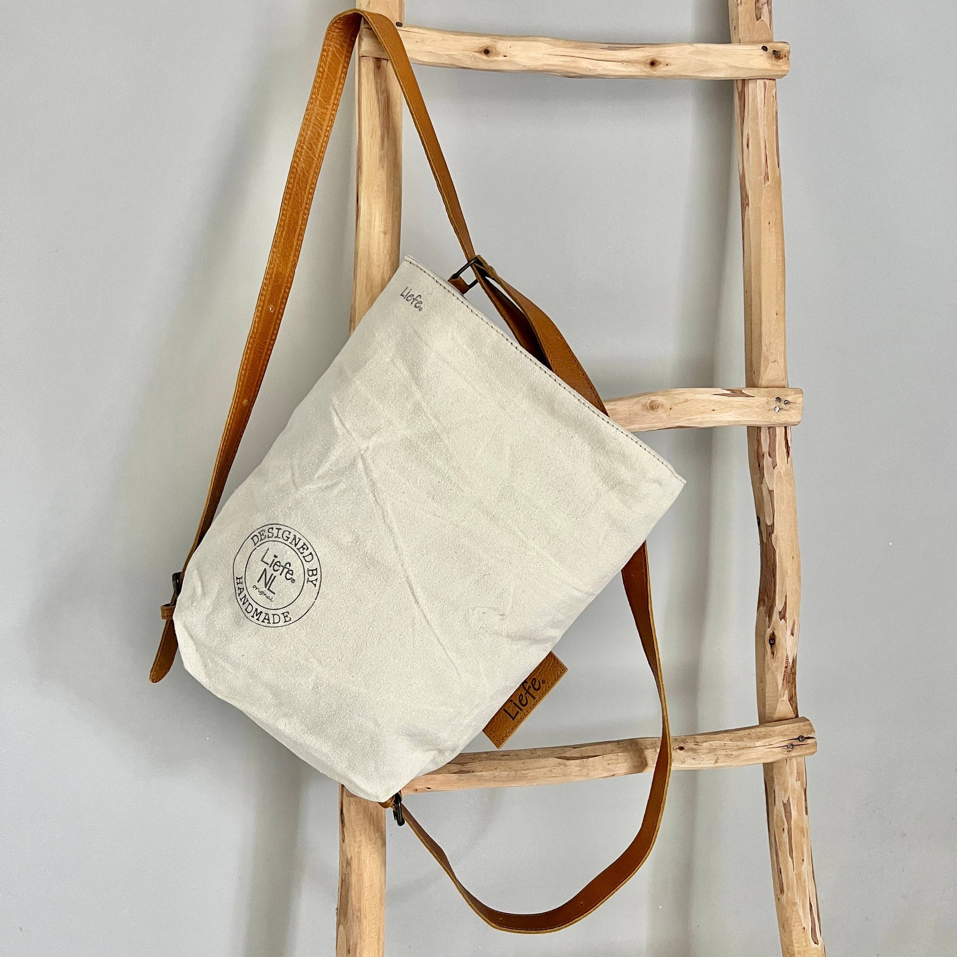 Der BackBag ist eine coole Tasche, die auf zwei Arten getragen werden kann. Die Tasche ist als Rucksack konzipiert, aber indem man die Lederschulterriemen nach oben zieht, entsteht eine Umhängetasche. Der coole Look der Tasche wird auch durch das recyceltes Canvas, ein robuster Stoff in einem schönen Naturton, geschaffen. Die Marke arbeitet mit wiederverwendeten Stoffen, dadurch können Beschädigungen oder Flecken im Stoff vorhanden sein, diese werden unter einem Patch abgedeckt. Die Lederschulterriemen sind verstellbar. Die Innenseite ist mit gestreiftem Baumwollstoff gefüttert und mit einem Innenfach mit Reißverschluss und einem verstärkten Laptop-Fach (max. 14 Zoll Laptop passt hinein) ausgestattet. Die Tasche schließt mit einem groben Reißverschluss. Die Maße sind 35 cm hoch, 32 cm breit und der Boden 14 cm. Der runde Liefe NL Stempel befindet sich auf der Vorderseite der Tasche. Farben können durch die Verwendung von recycelten und gebrauchten Stoffen variieren.