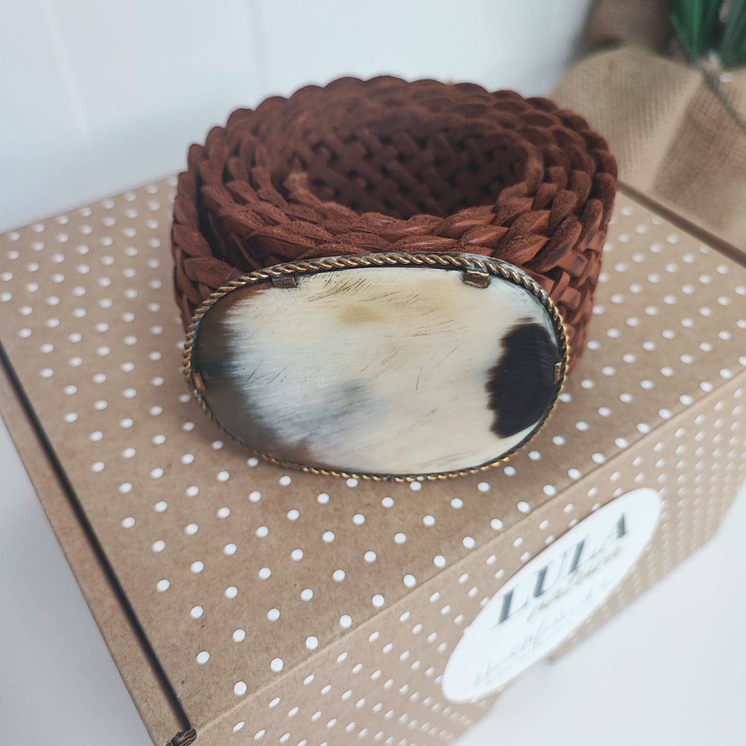 Der Lula Natura Ledergürtel „VENUS“ ist ein ausdrucksstarker, breiter Flechtgürtel aus echtem braunem Leder, der durch seine besondere Schnallenplatte zum absoluten Blickfang wird.
