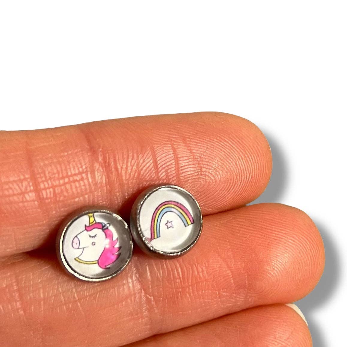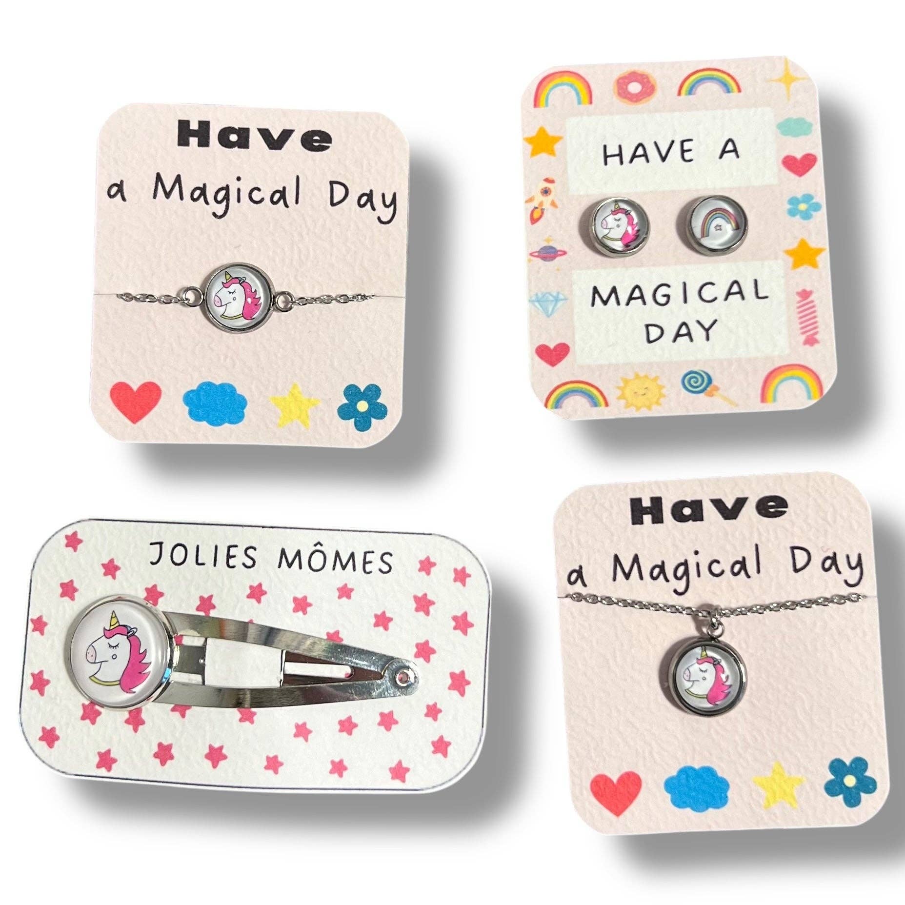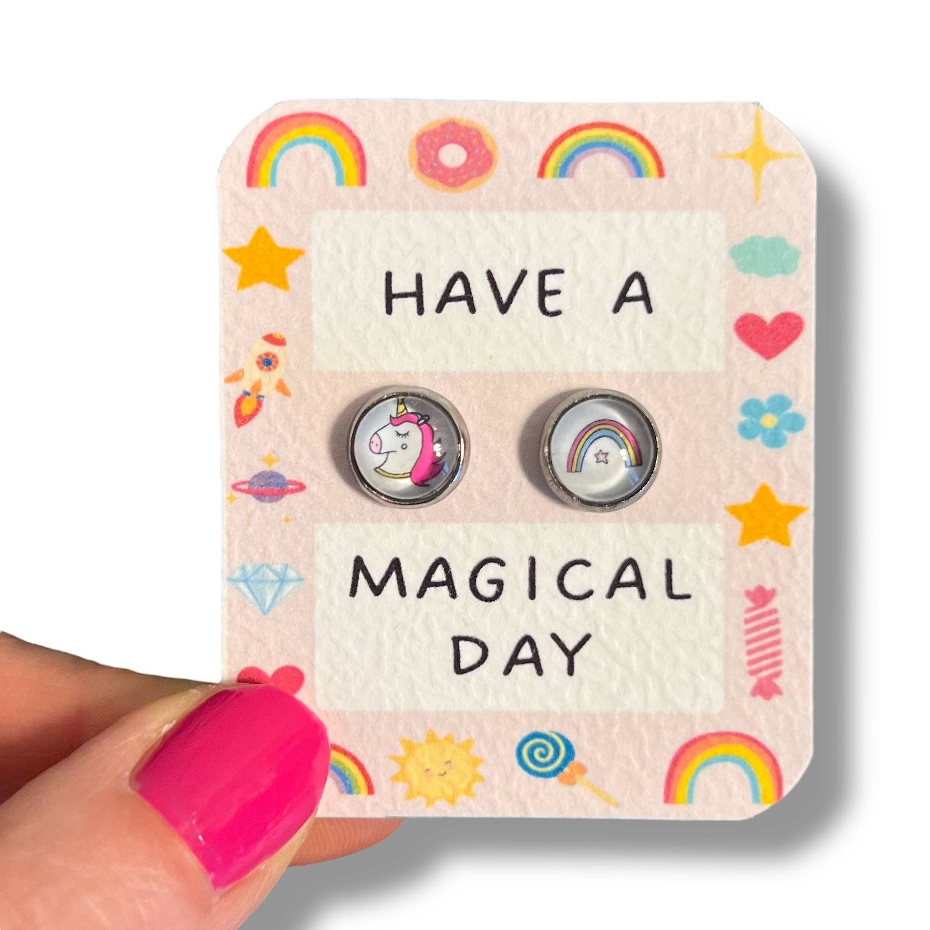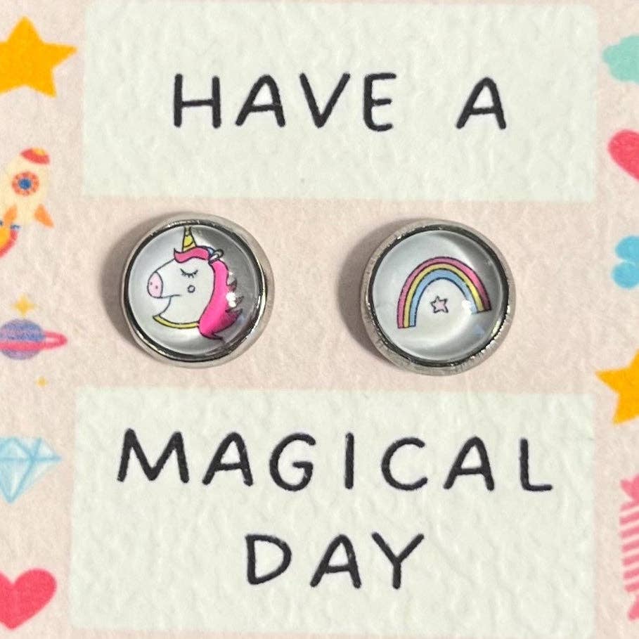 Kinder-Ohrringe Einhörner auf kleinem handgemachtem Kraftpapierhalter ♥ Nachricht: "Have a magical day!" • MAßE: - Durchmesser des Cabochons: 8mm • MATERIALIEN: - Silberfarbene Fassung (Edelstahl) - Illustration gezeichnet, geschützt durch eine Harzschicht und einen Glascabochon - Nickelfrei