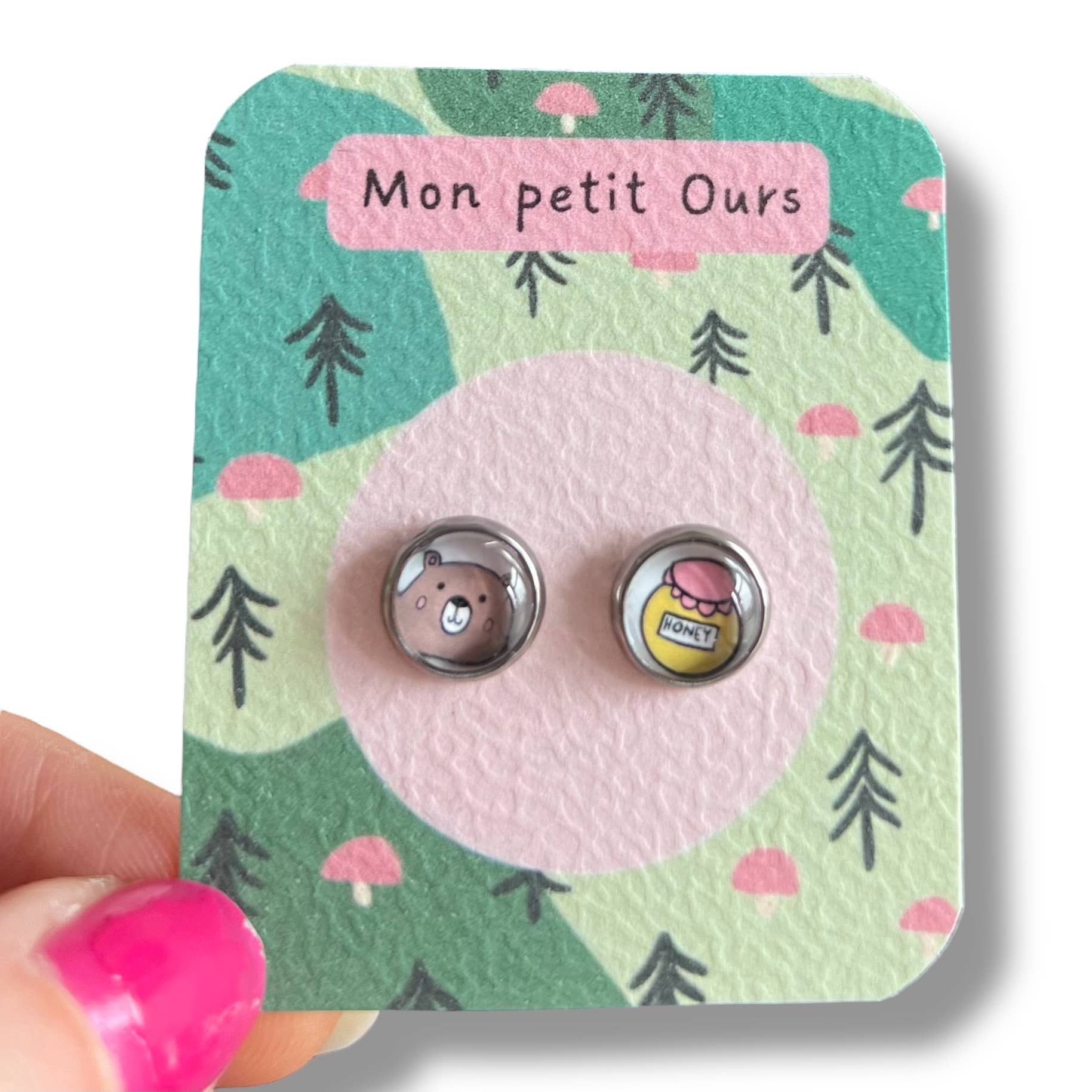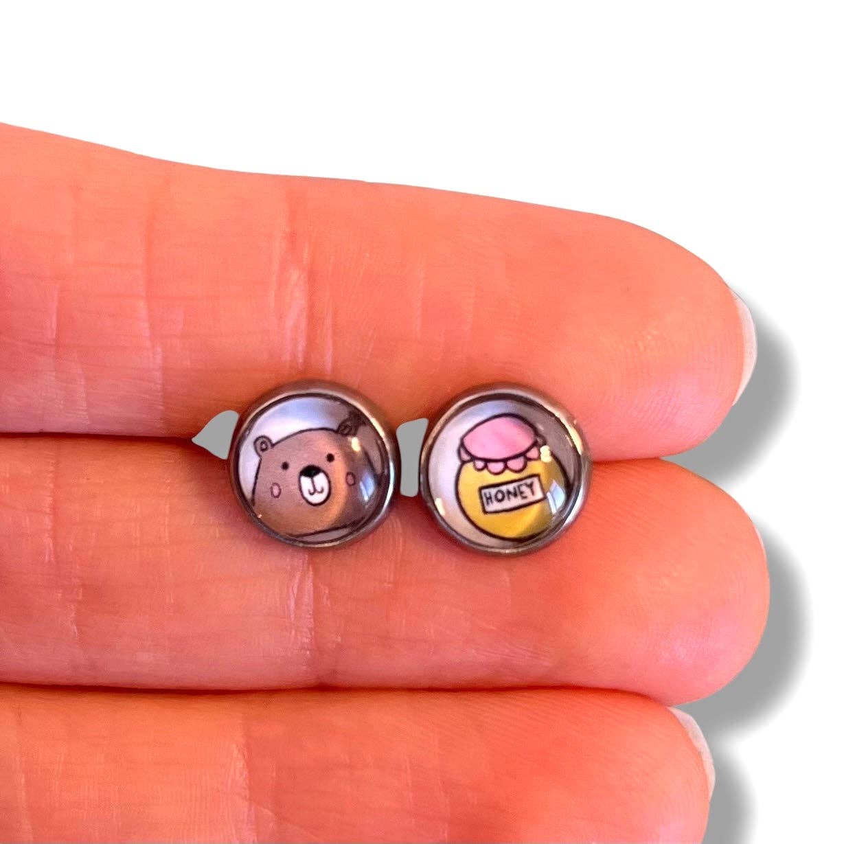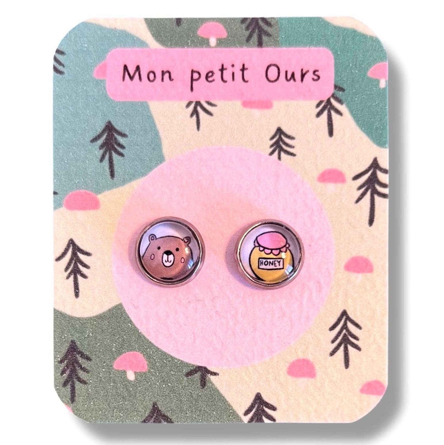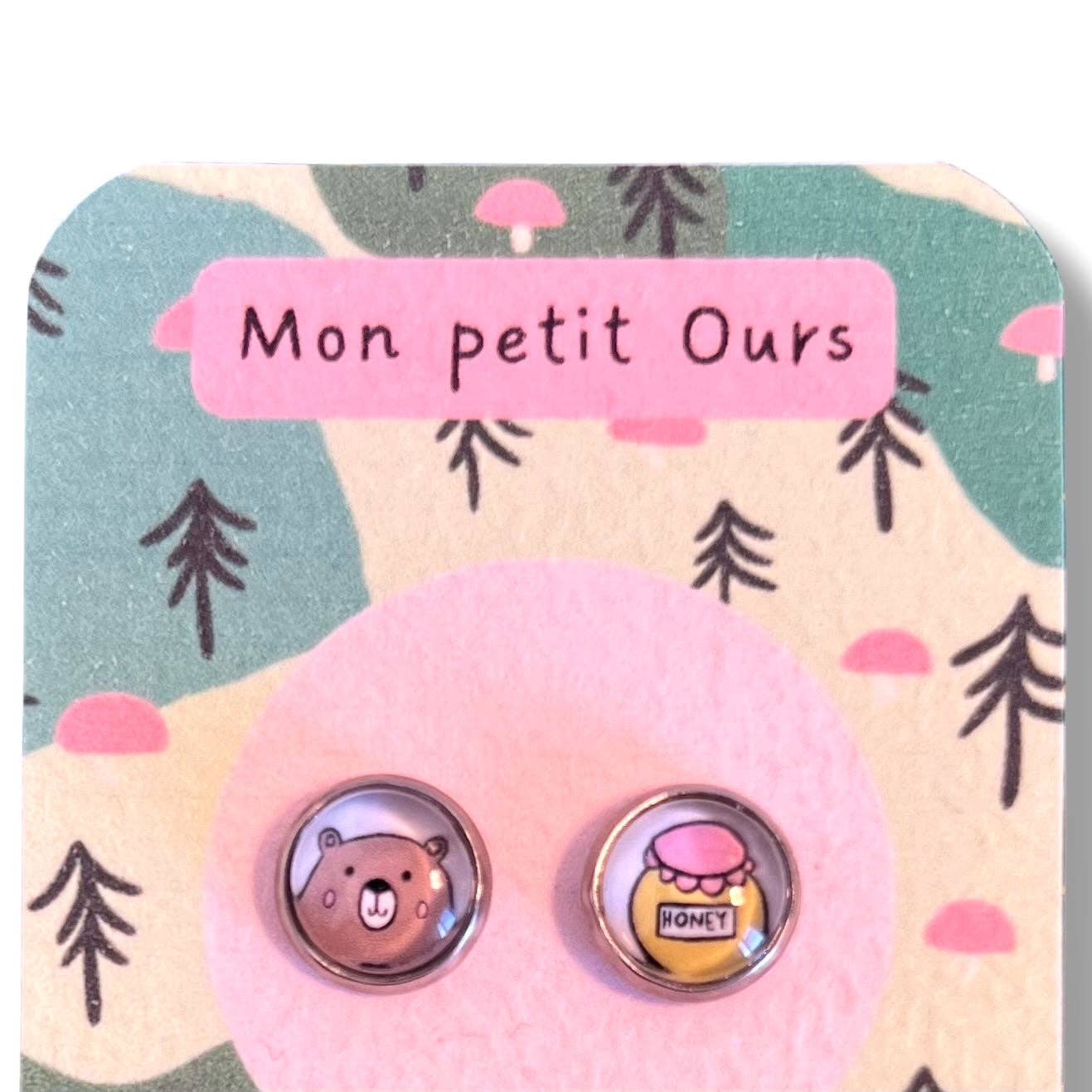 Kinder-Ohrringe kleiner Bär auf kleinem handgemachtem Träger ♥ Nachricht: Mein kleiner Bär! • MAßE: - Durchmesser des Cabochons: 8mm • MATERIALIEN: - Träger und Kette aus Edelstahl - Hergestellt aus einem schönen Motiv, das mit dem Grafiktablett erstellt wurde - Bild geschützt durch eine Schicht Harz und einen Glascabochon - Nickelfrei