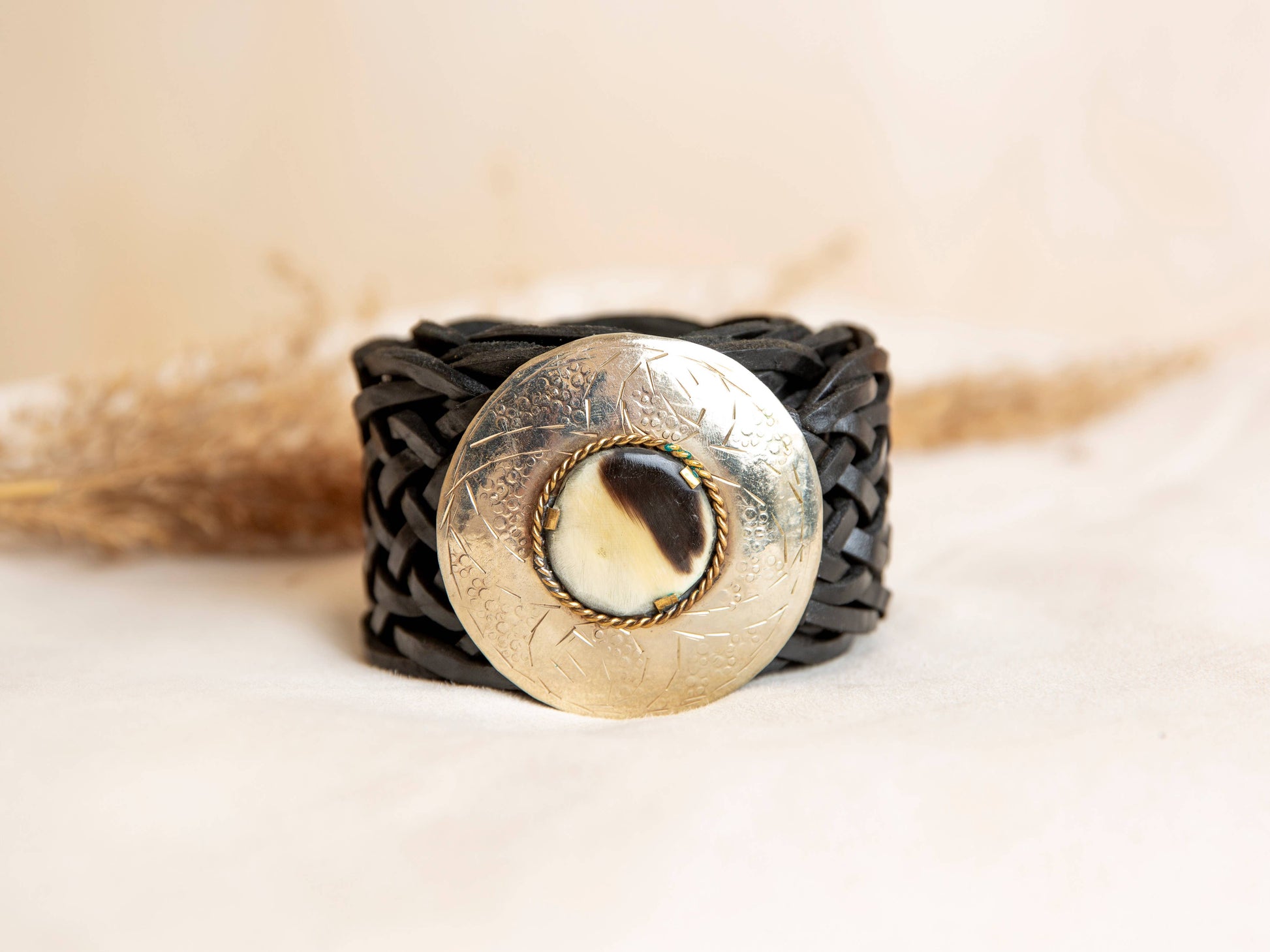 Handgefertigter, breiter Flechtgürtel aus schwarzem Rindsleder mit markanter runder Messingschnalle und Perlmutt-Mittelstein – jedes Stück ein Unikat.