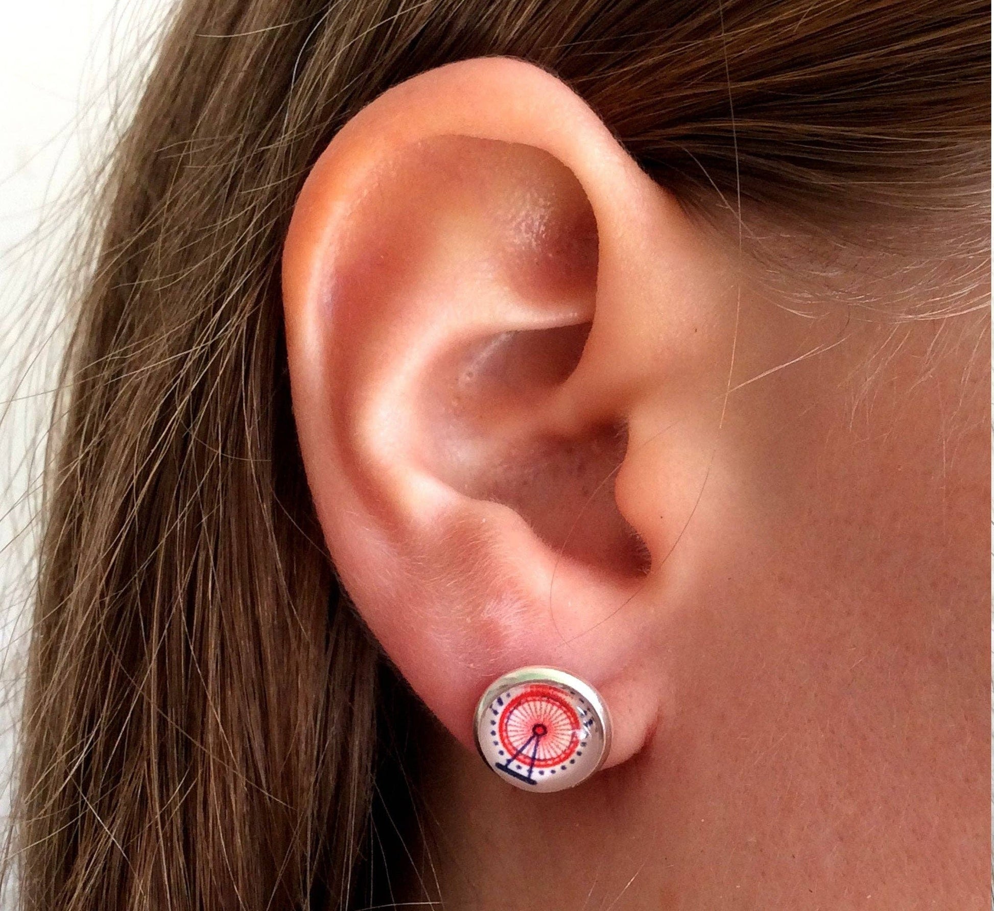 London Big Ben und Riesenrad Ohrstecker auf kleinem handgemachtem Kraftpapierhalter ♥ Nachricht: "London is always a good idea!" • MAßE: - Durchmesser des Cabochons: 10 mm • MATERIALIEN: - Silberfarbene Fassung (Edelstahl) - Hergestellt aus einem hochauflösenden Foto, geschützt durch eine Harzschicht und einen Glascabochon - Nickelfrei