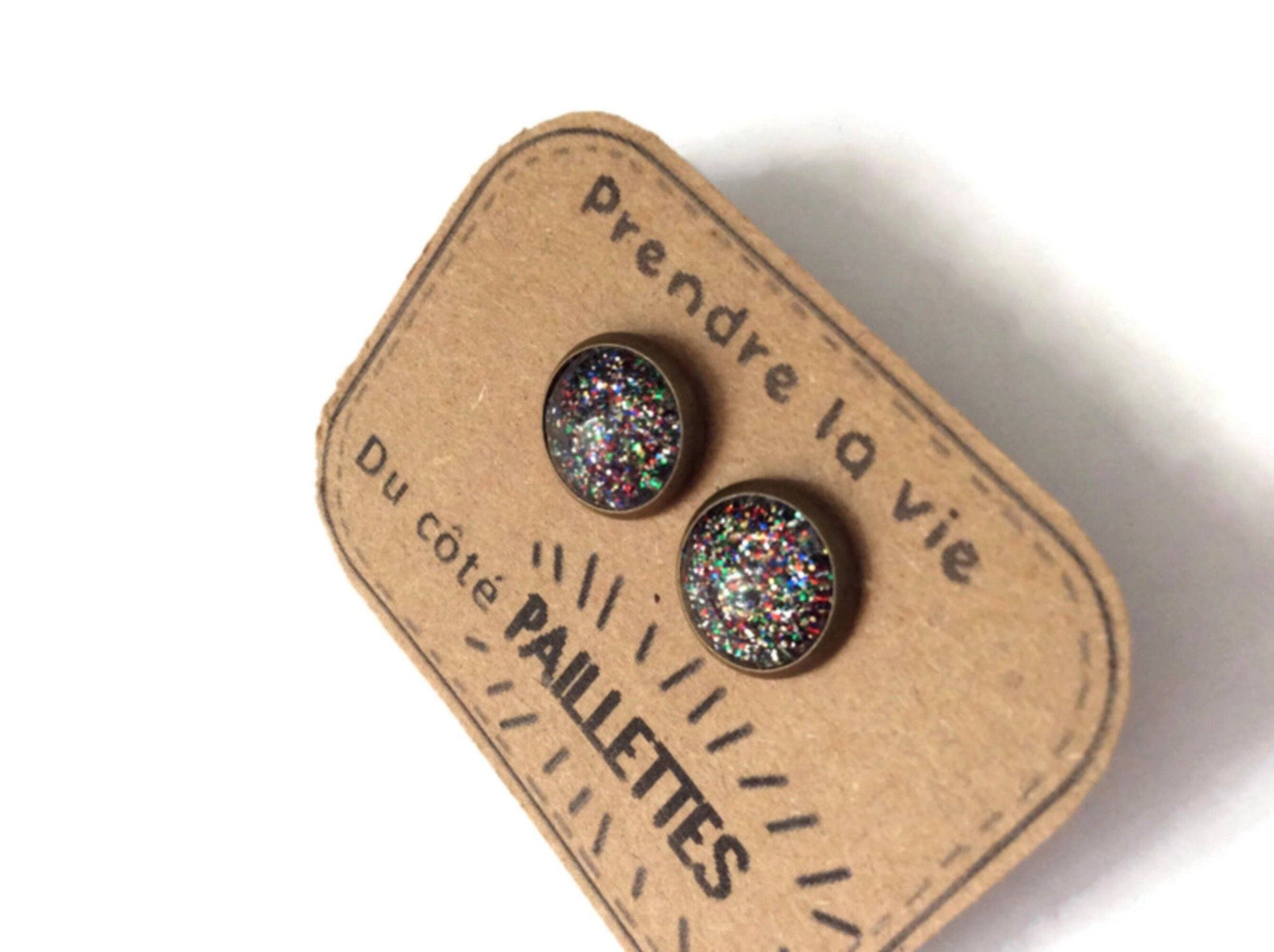 Mehrfarbige Glitzer-Ohrstecker auf kleinem, selbstgemachtem Kraftpapierhalter ♥