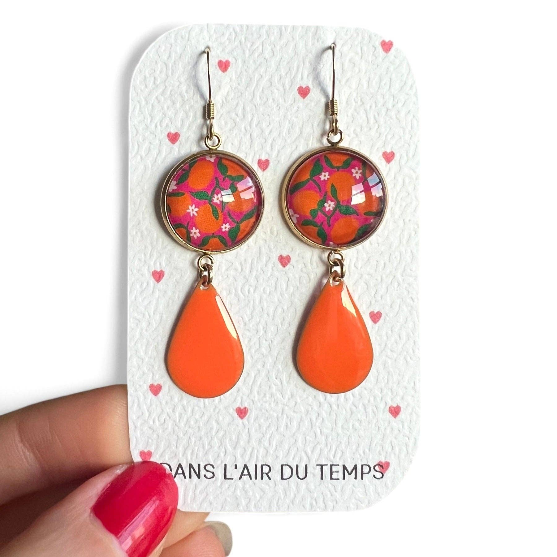 ORANGE HÄNGENDE OHRRINGE auf rosa Hintergrund, orange Emaille: Silber
