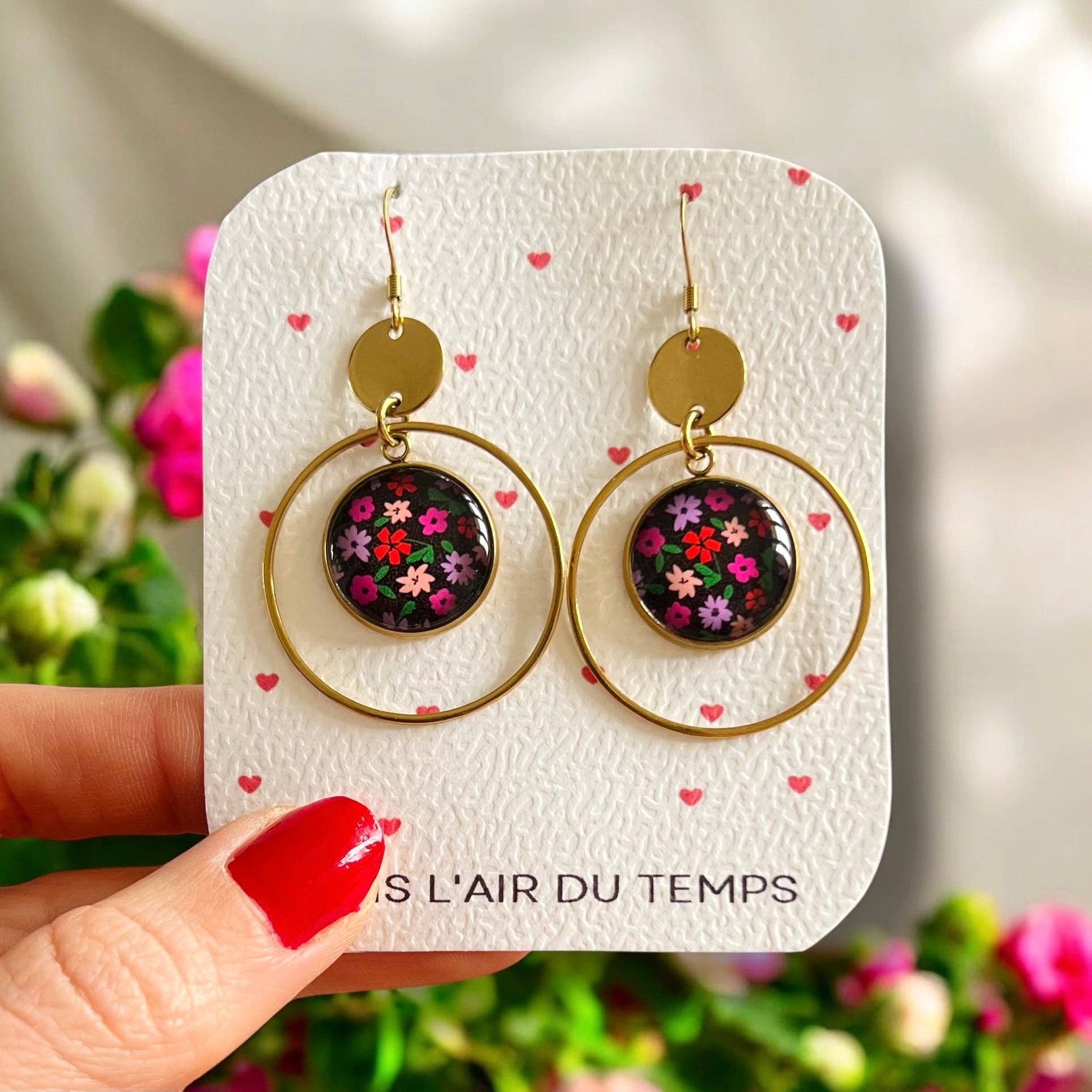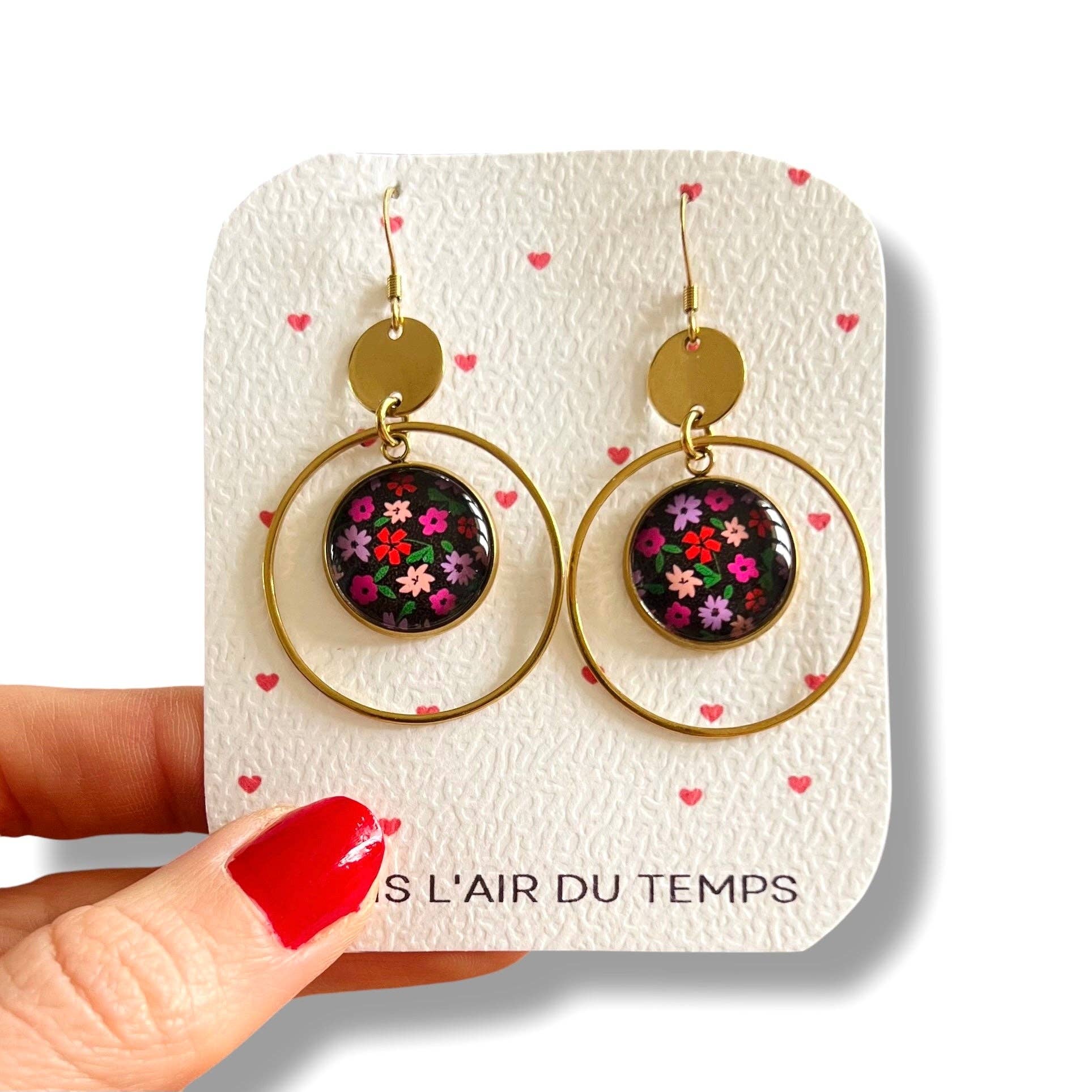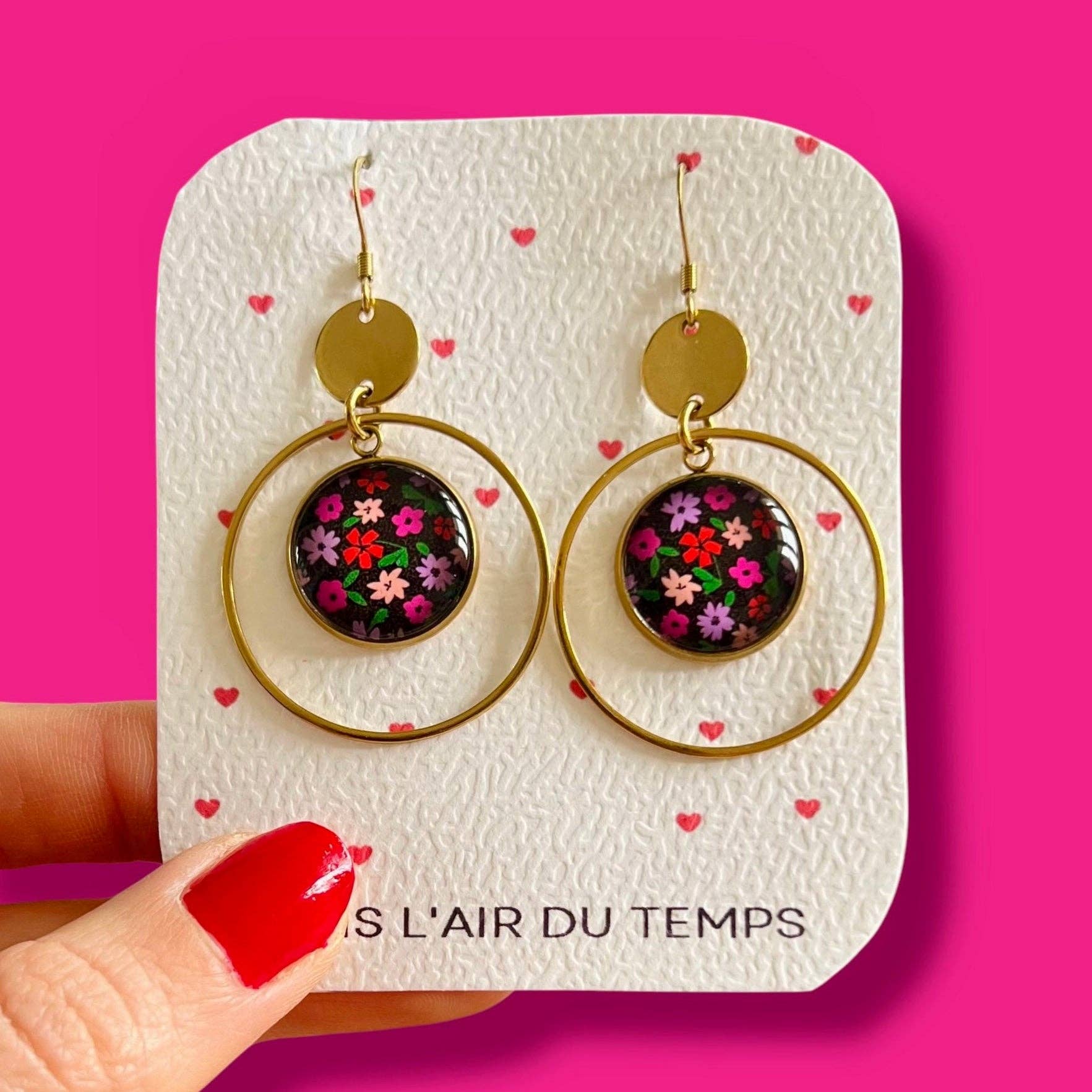 Creolen-Ohrringe mit buntem Blumenmuster ♥ • MAßE: - Durchmesser des Rings: 30 mm - Durchmesser des Cabochons: 16 mm - Gesamtlänge: 55 mm • MATERIALIEN: - Halterung in Gold- oder Silberfarbe (Edelstahl) - Hergestellt aus einem hübschen Muster, das mit dem Grafiktablett erstellt wurde - Bild geschützt durch eine Harzschicht und einen Glascabochon - Nickelfrei