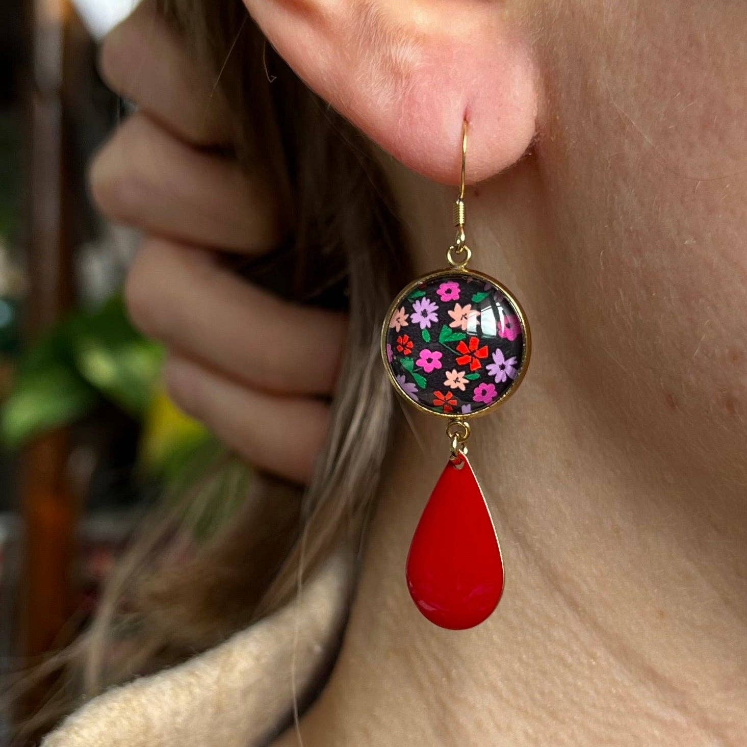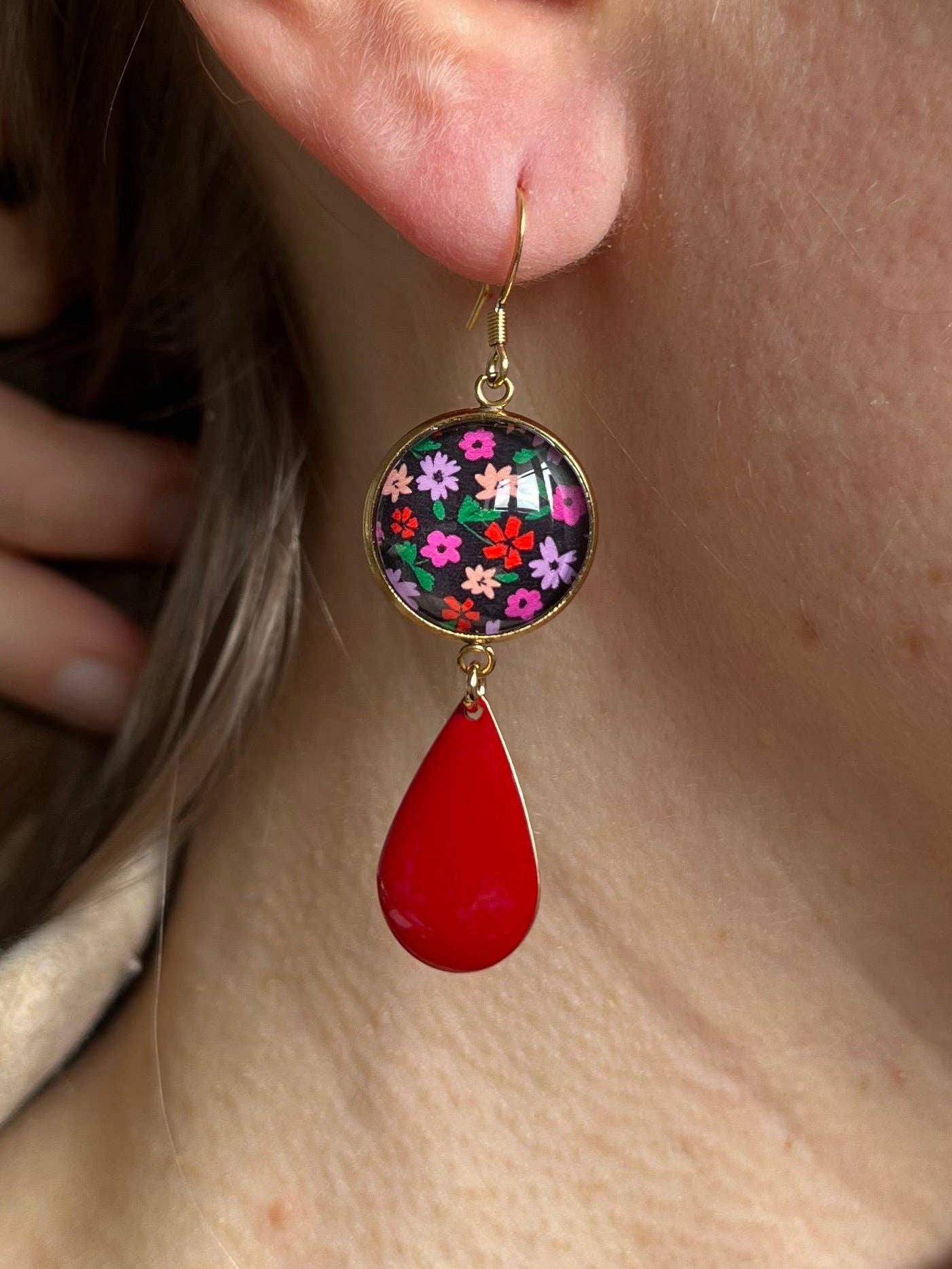 Goldene hängende Ohrringe mit rosa und roten Blumen ♥