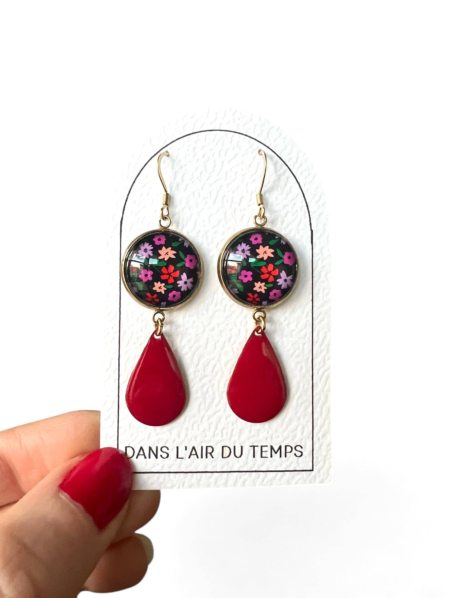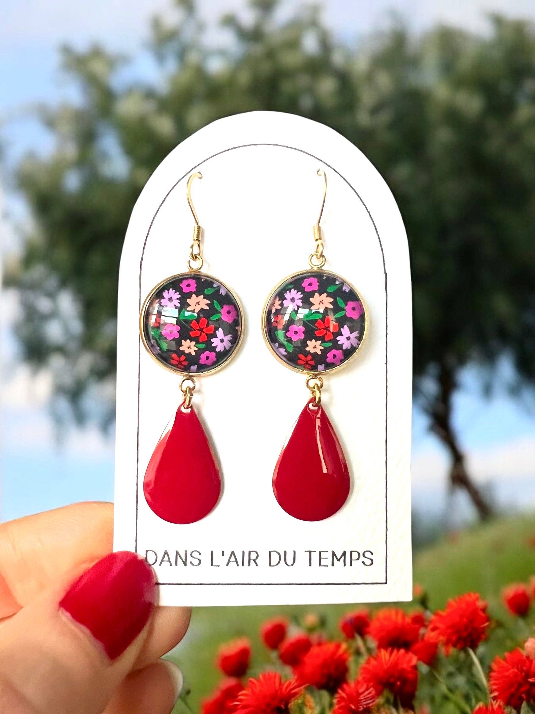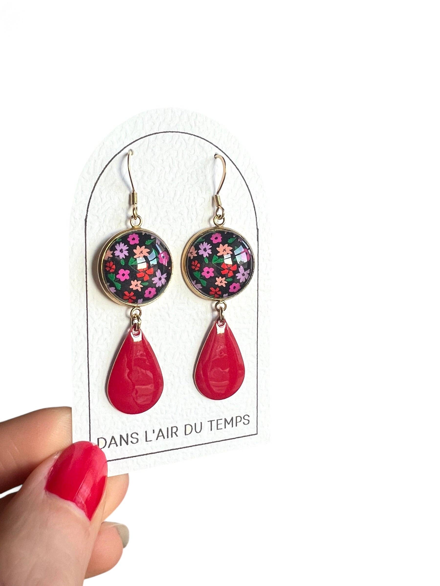 ROSEN- UND ROTBLUMEN-OHRRINGE auf schwarzem Hintergrund, rotes Email, goldene oder silberne Ausführung: Silber