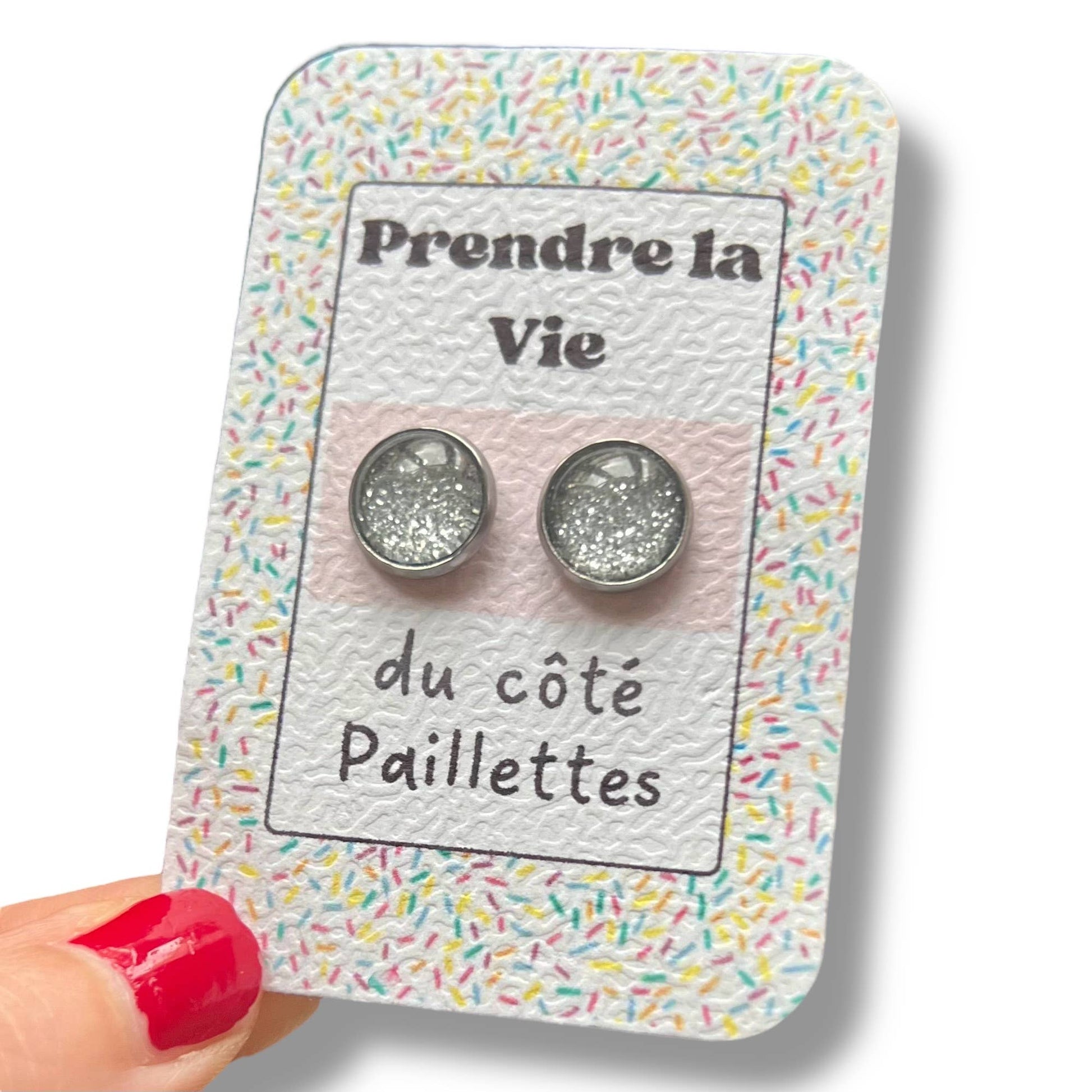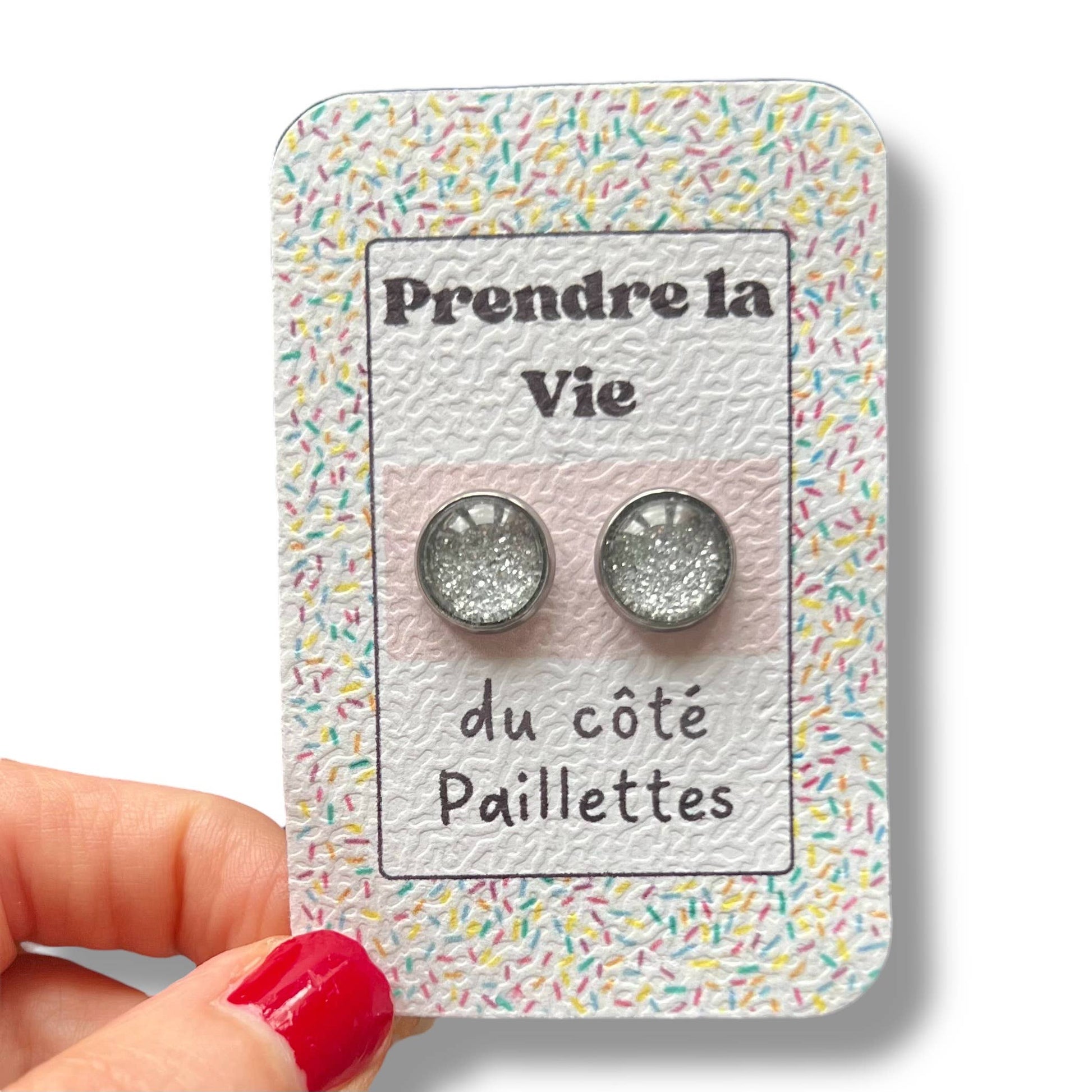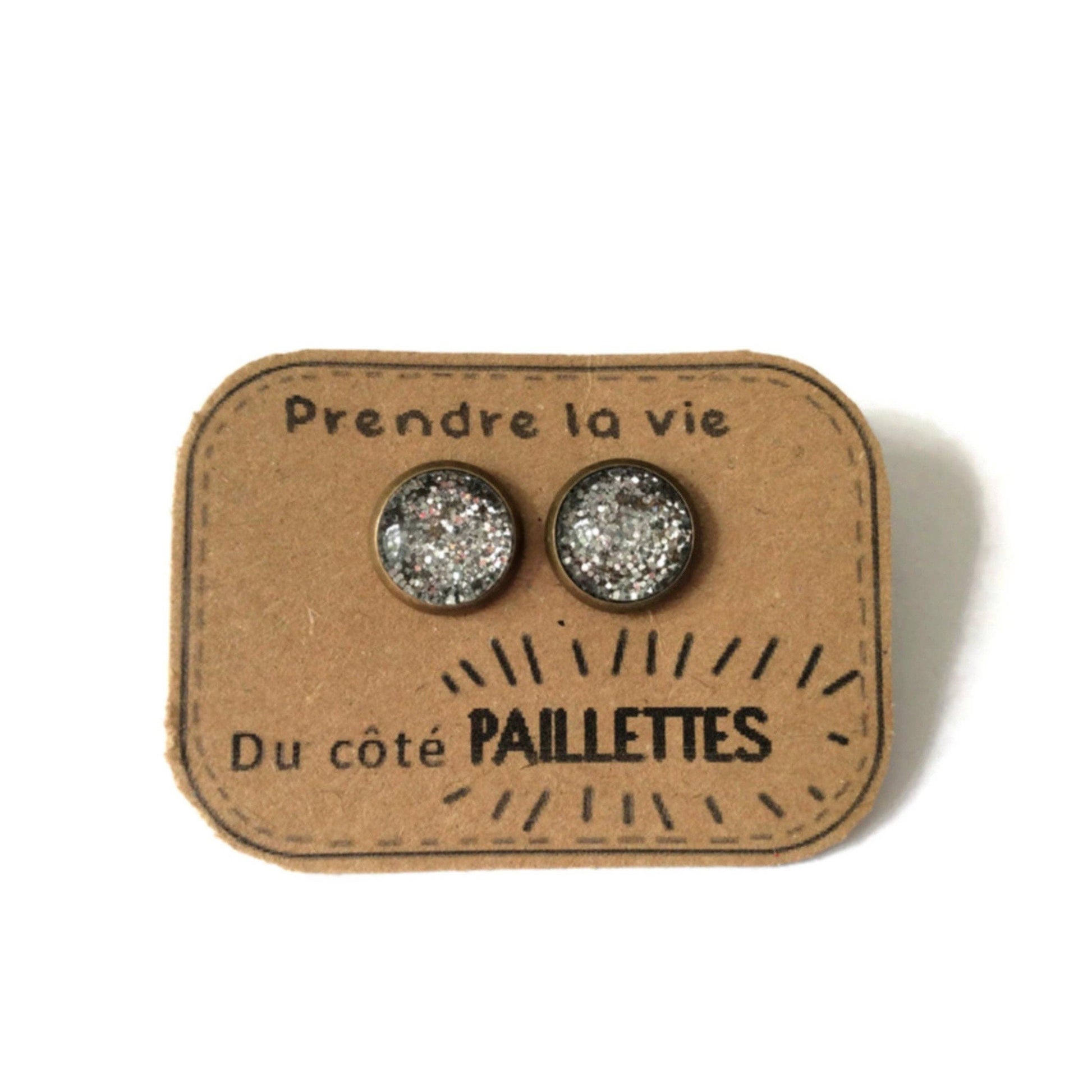 Silberne Glitzer-Ohrstecker auf kleinem, handgefertigtem Kraftpapierträger