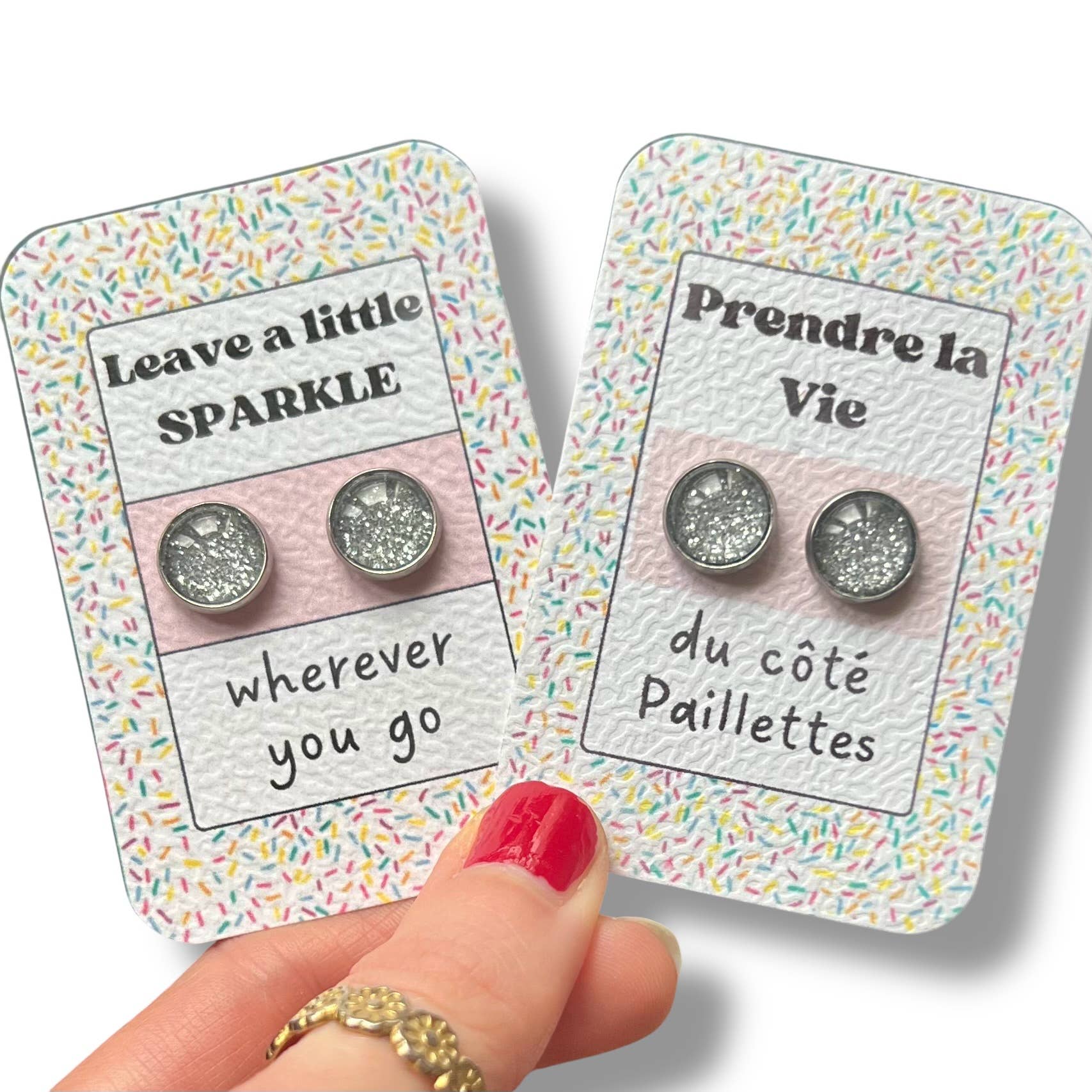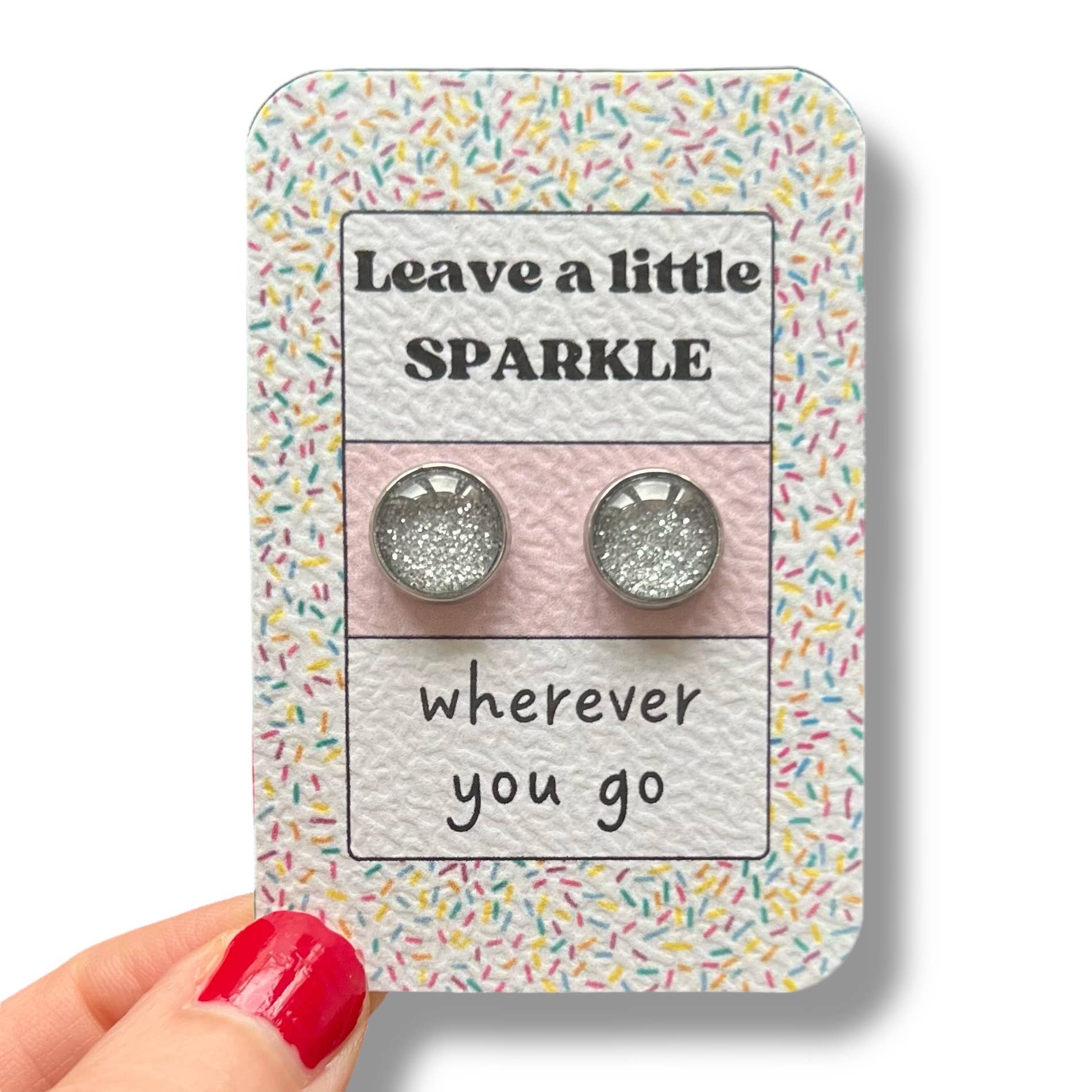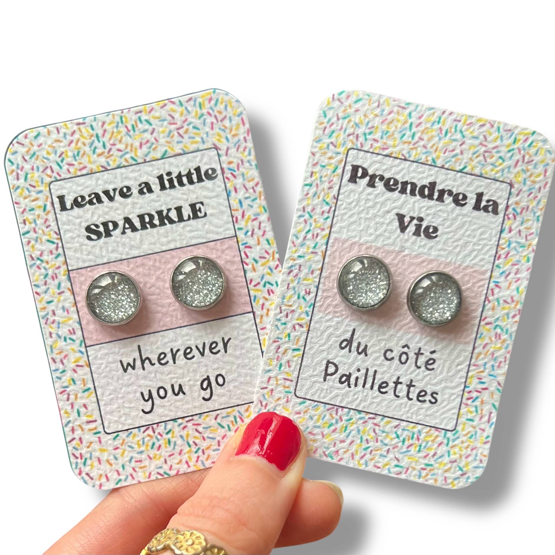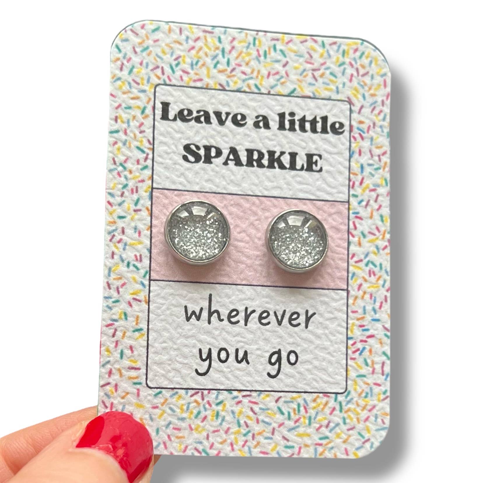 Silberne Glitzer-Ohrstecker auf kleinem, handgefertigtem Kraftpapierträger