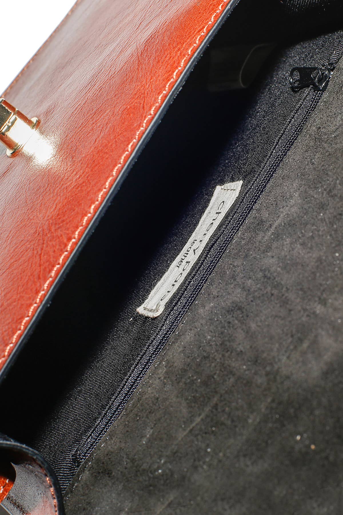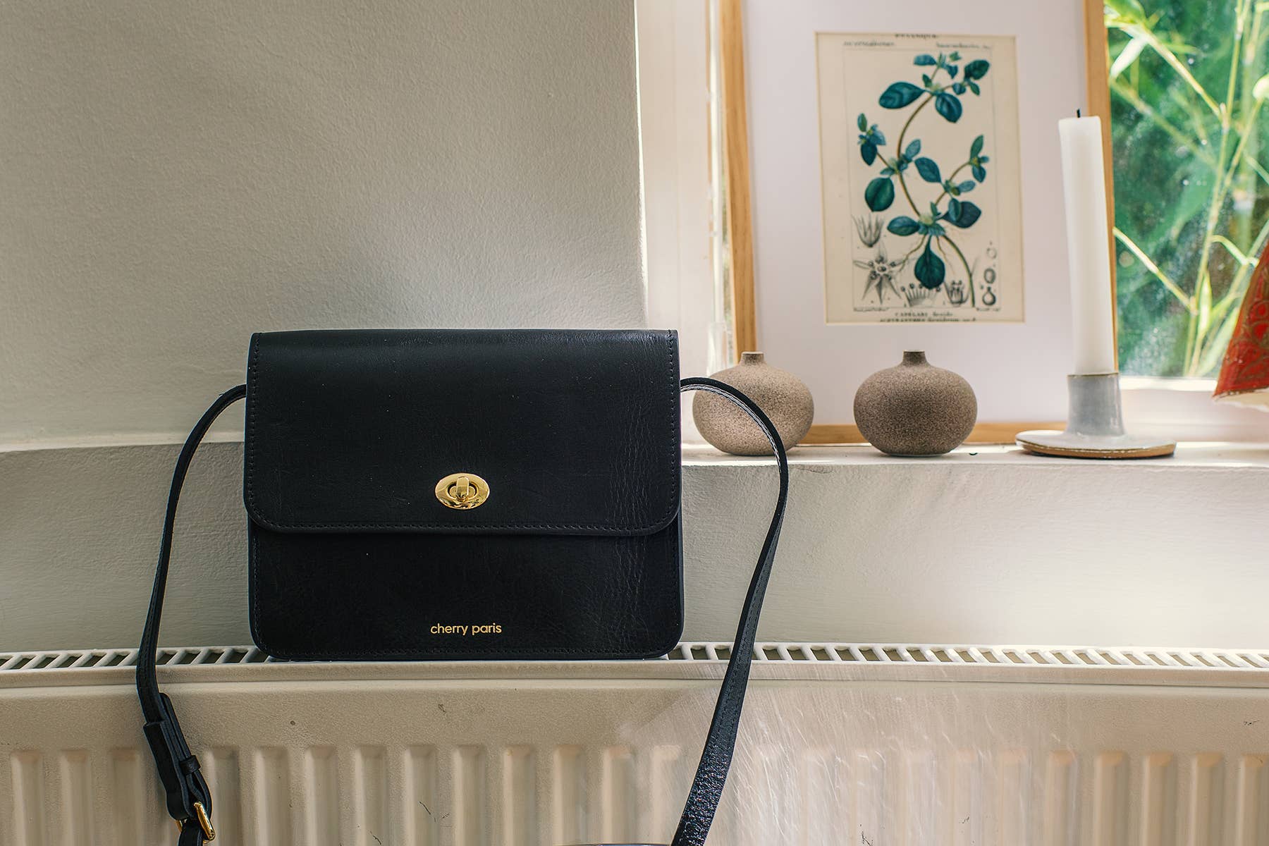 Umhängetasche aus Rindsleder. Verstellbarer Schulterriemen. Klappe mit Drehverschluss. Innere Reißverschlussöffnung. Abmessungen: 21,5x17x6,5cm