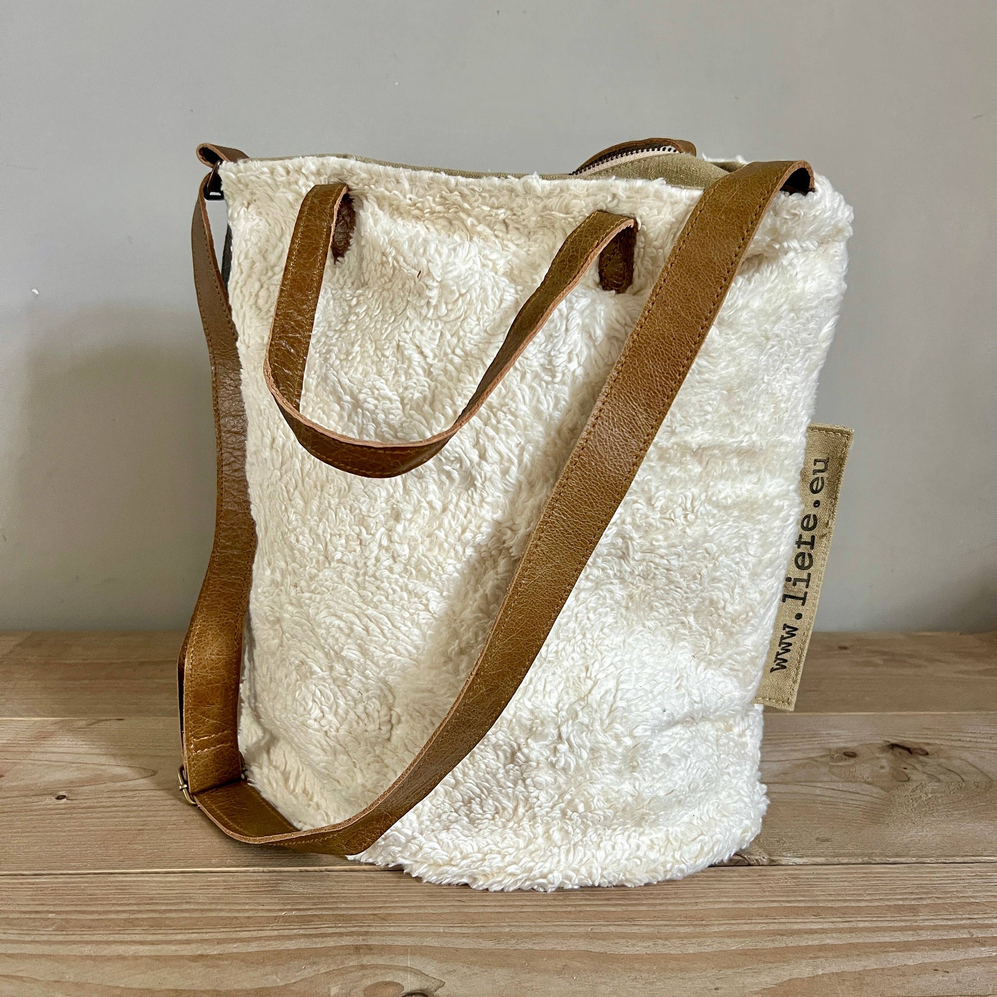 Die Teddy BucketBag 40 cm x 38 cm mit 18 cm ovalem Boden besteht aus Baumwoll-Teddy und recycelter Baumwolle mit einem verstellbaren Schulterriemen aus Leder und zwei Lederstäben. Die Innenseite ist vollständig mit einem braunen/weißen Baumwollstreifen ausgekleidet und verfügt über mehrere Innentaschen, darunter eine mit Reißverschluss. Sowohl die ovale Unterseite als auch die Oberseite mit dem Reißverschluss bestehen aus recycelter Baumwolle. Tragen Sie den BucketBag als Umhängetasche, über der Schulter oder in der Hand. Die BucketBag wird mit einem großen Reißverschluss geschlossen. Das verwendete Leder stammt aus Resten. Wie alle Liefe-Taschen wird auch diese Tasche in einer kleinen Werkstatt hergestellt, in der Nachhaltigkeit von großer Bedeutung ist.