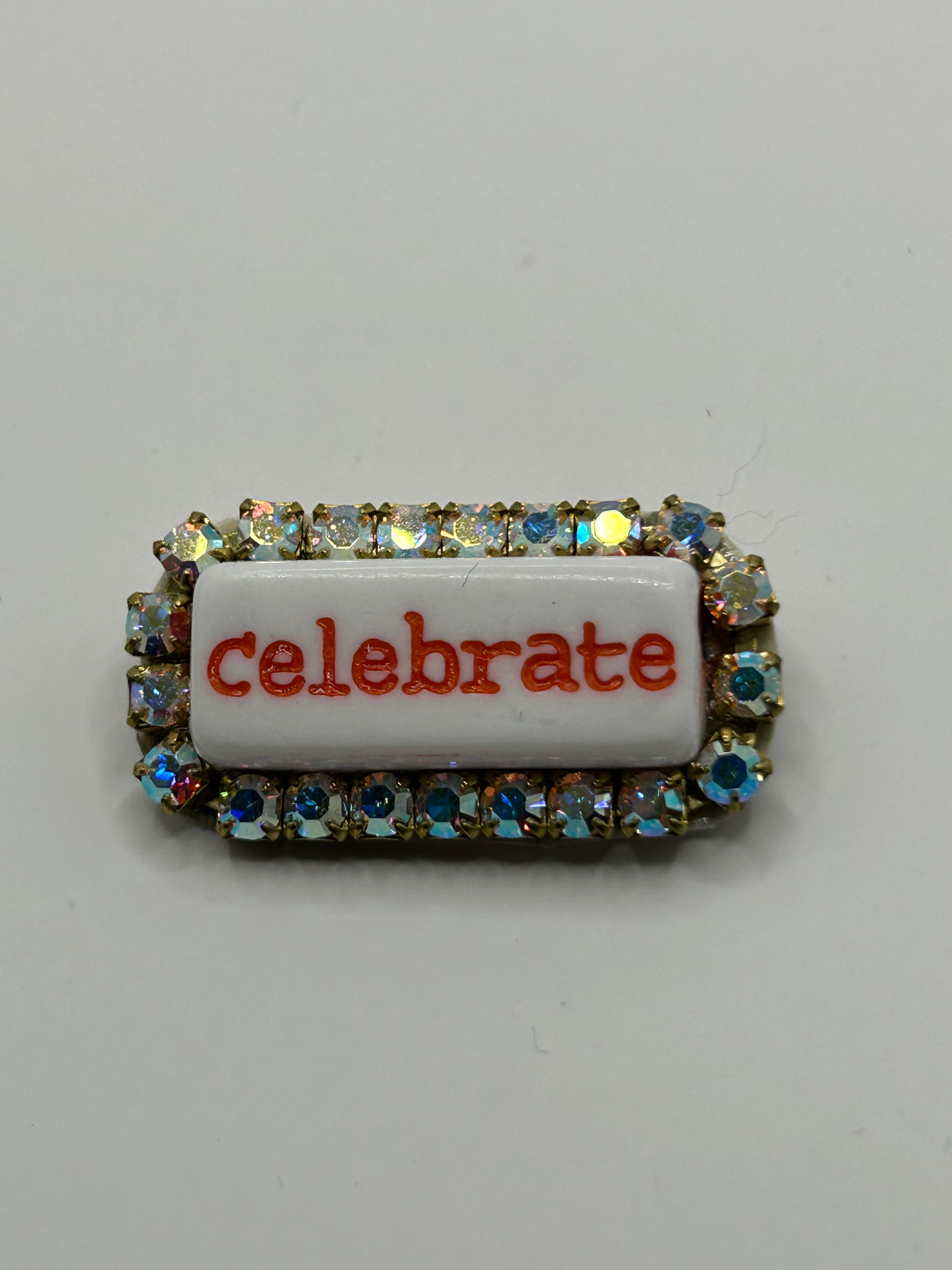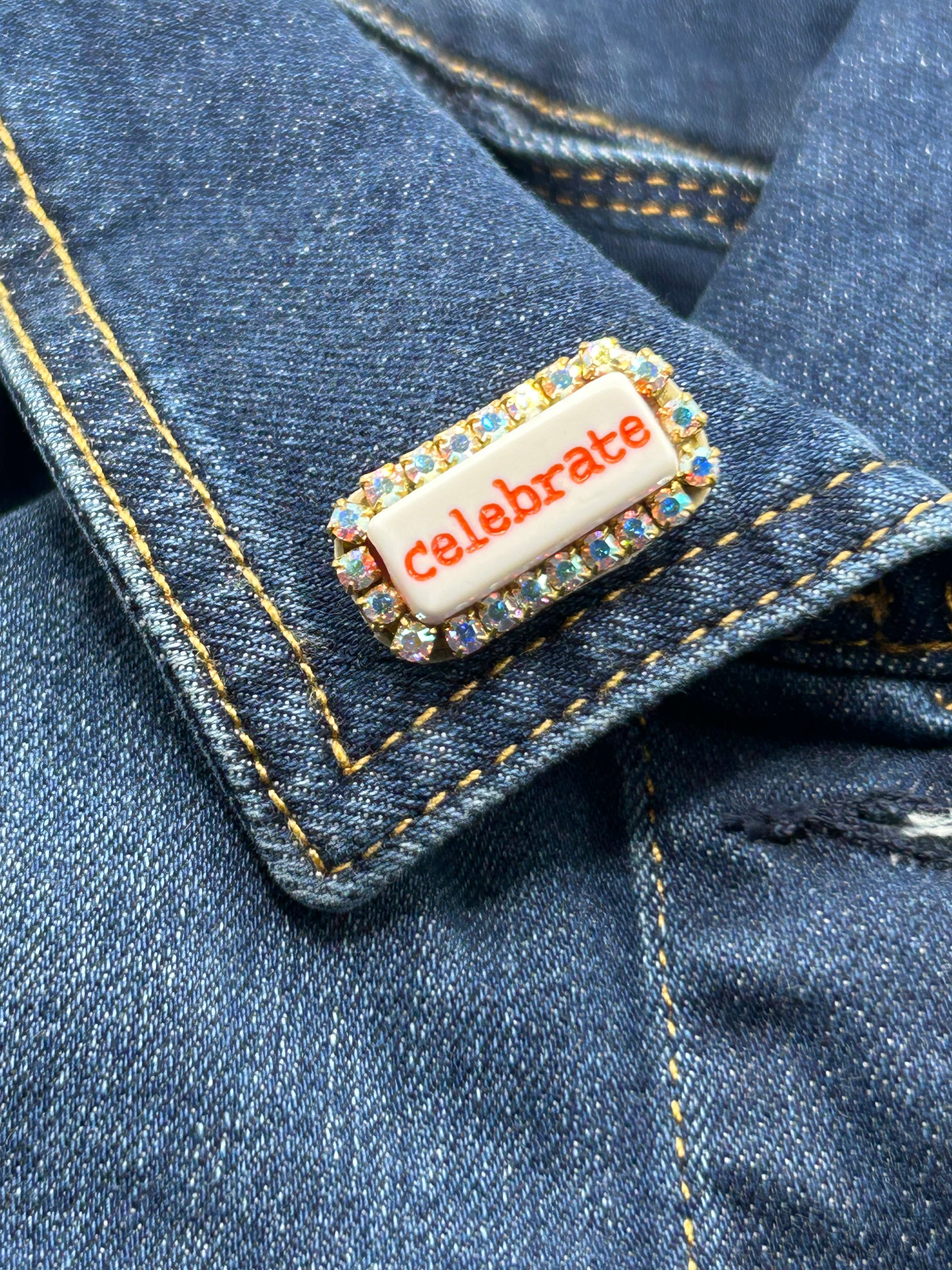 Der weiße Mittelstein mit rotem Schriftzug „celebrate“ wird von funkelnden, schimmernden Strasssteinen umrahmt und verleiht jedem Outfit einen festlichen, positiven Akzent.