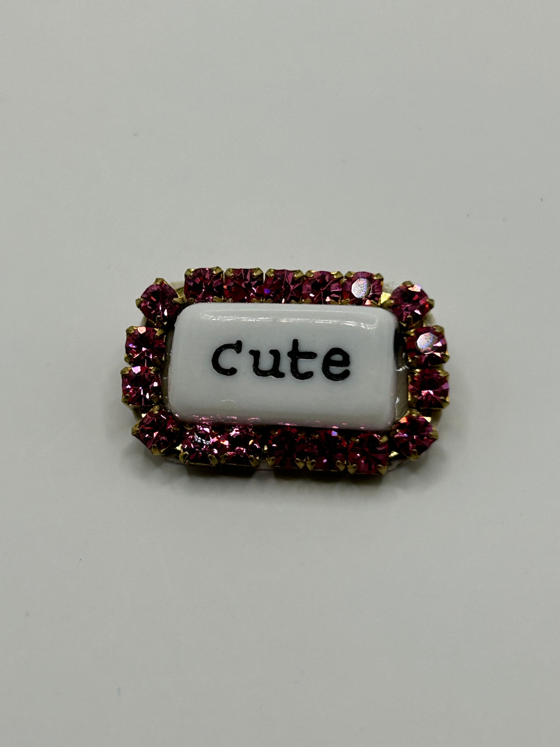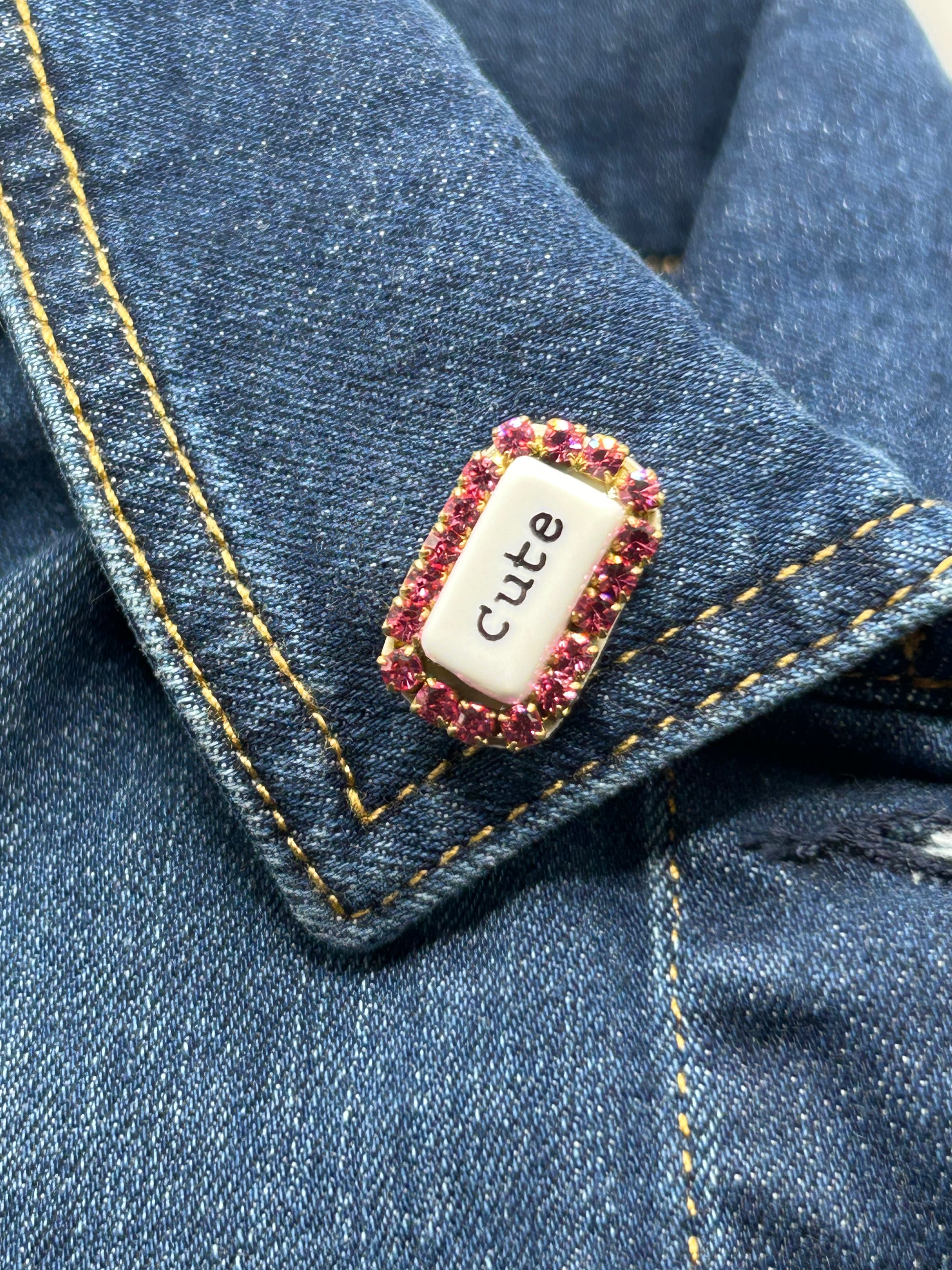 Die Tezee Statement-Brosche „cute“ ist ein echter Blickfang für alle, die verspielten Glamour lieben. Der cremeweiße Mittelstein mit schwarzem Schriftzug wird von funkelnden rosafarbenen Strasssteinen in edler Messingfassung umrahmt.