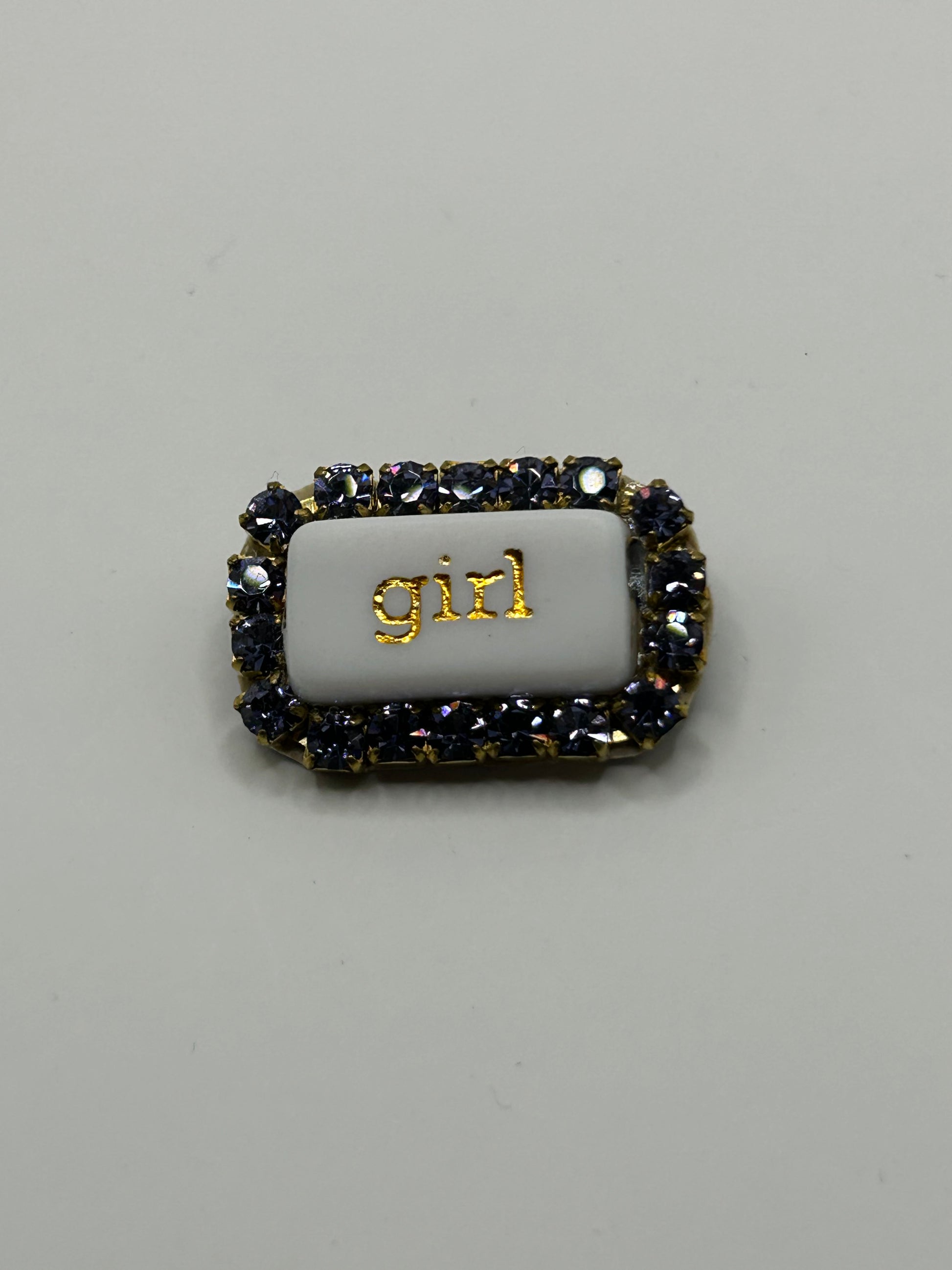 Der cremefarbene Mittelstein mit goldenem Schriftzug „girl“ wird von funkelnden dunklen Strasssteinen eingefasst und verleiht jedem Outfit einen modernen, selbstbewussten Akzent.
